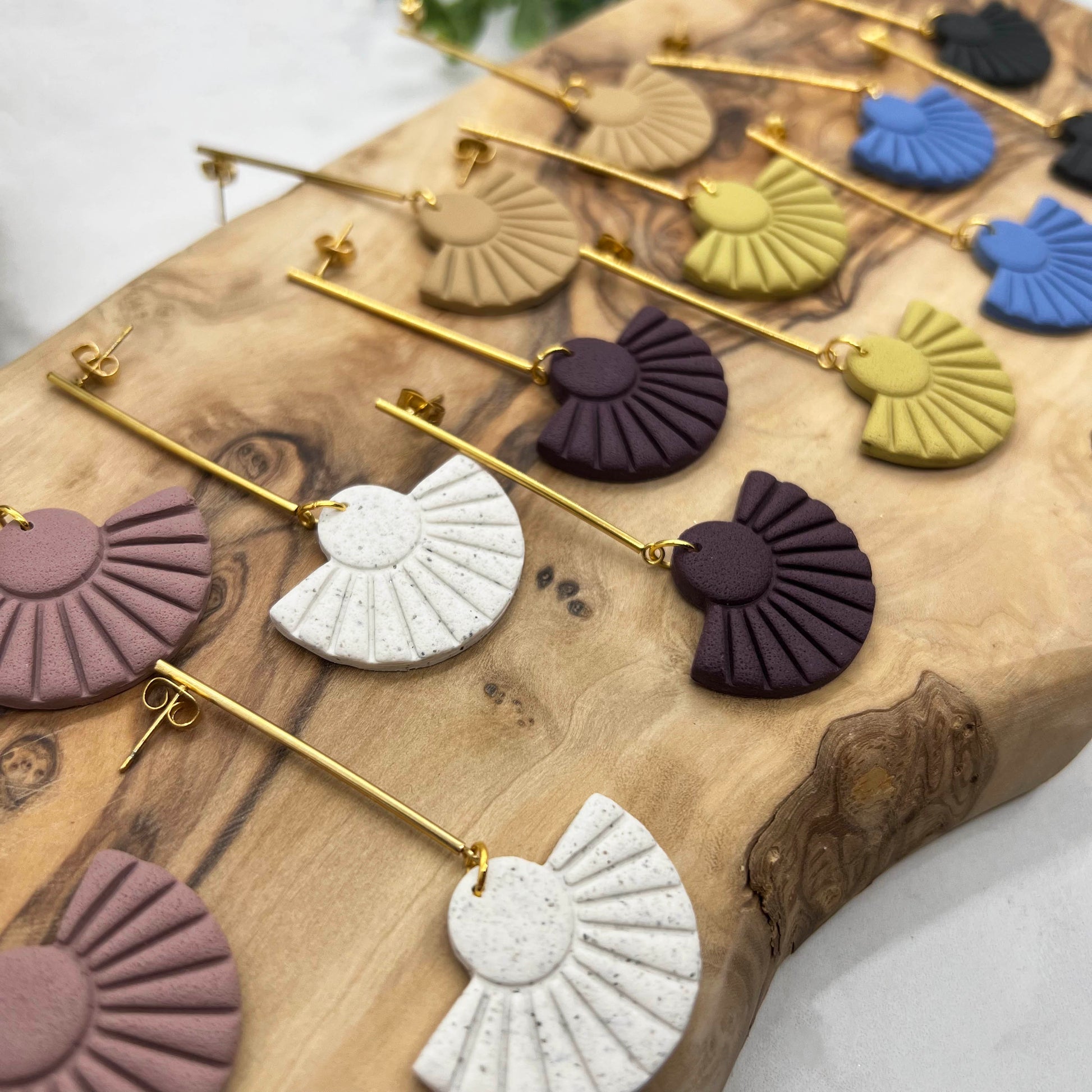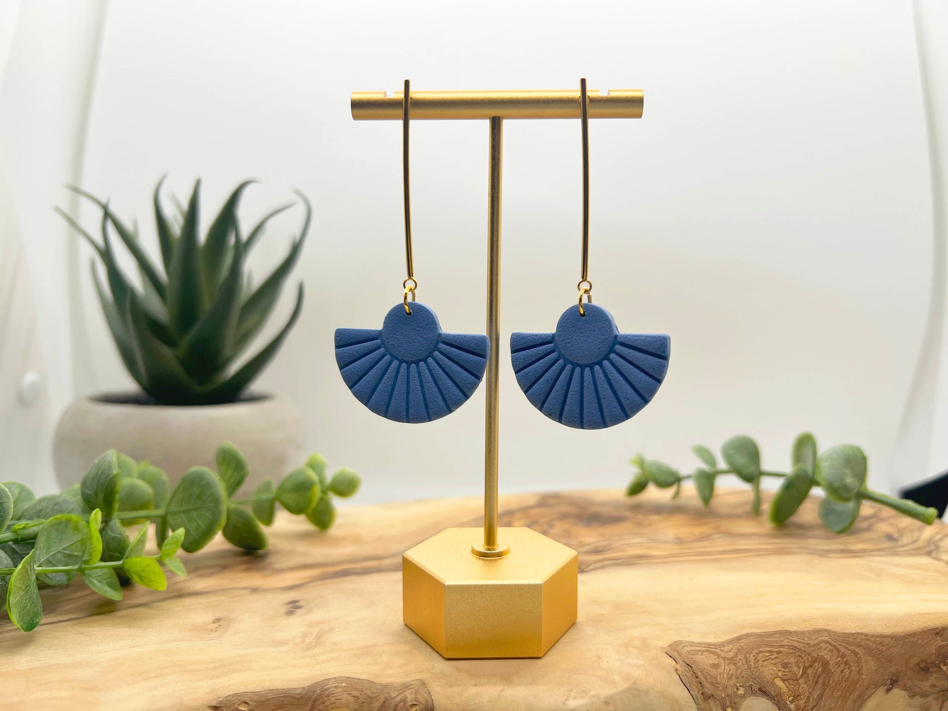 Textured dangly fan in airforce blue. Lightweight polymer clay earrings handmade in Austin, TX. No two designs are the same as they are individually made by hand.