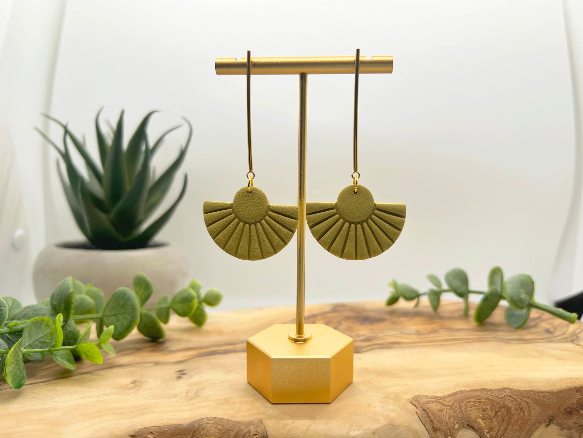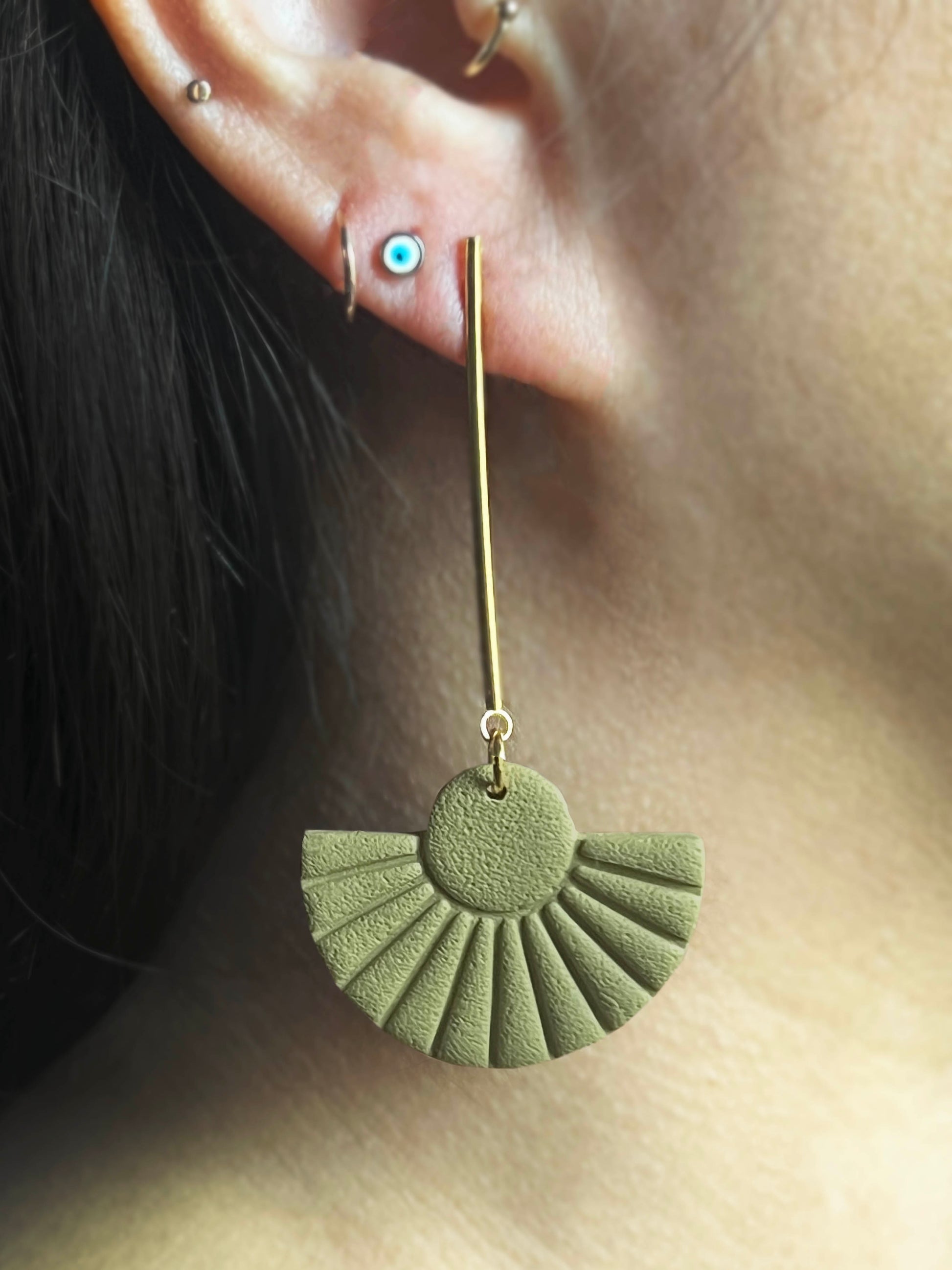 Textured dangly fan in pistachio. Lightweight polymer clay earrings handmade in Austin, TX. No two designs are the same as they are individually made by hand.