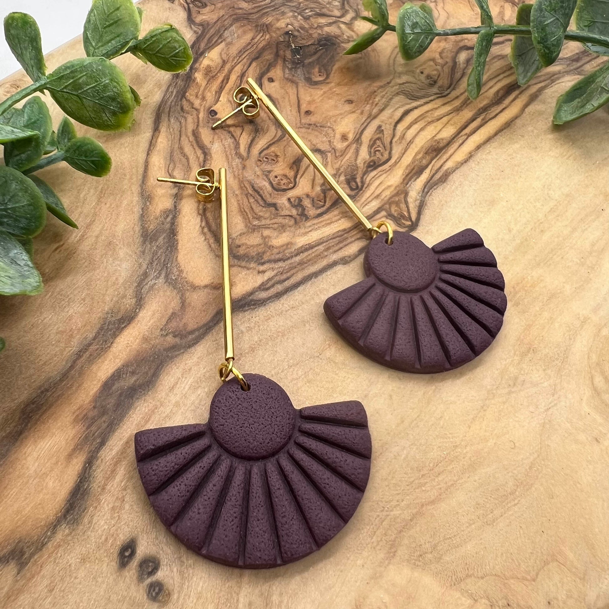 Textured dangly fan in plum. Lightweight polymer clay earrings handmade in Austin, TX. No two designs are the same as they are individually made by hand.
