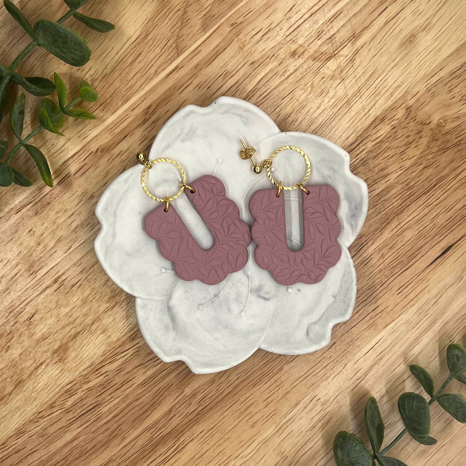 Statement botanical earrings with scalloped edge in lavendar. Lightweight polymer clay earrings handmade in Austin, TX. No two designs are the same as they are individually made by hand.