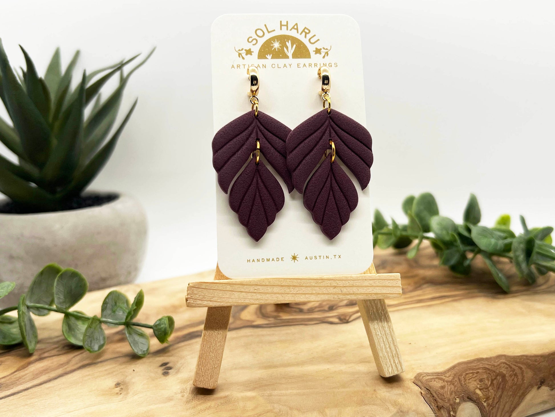 Textured dangly floral in plum. Lightweight polymer clay earrings handmade in Austin, TX. No two designs are the same as they are individually made by hand.