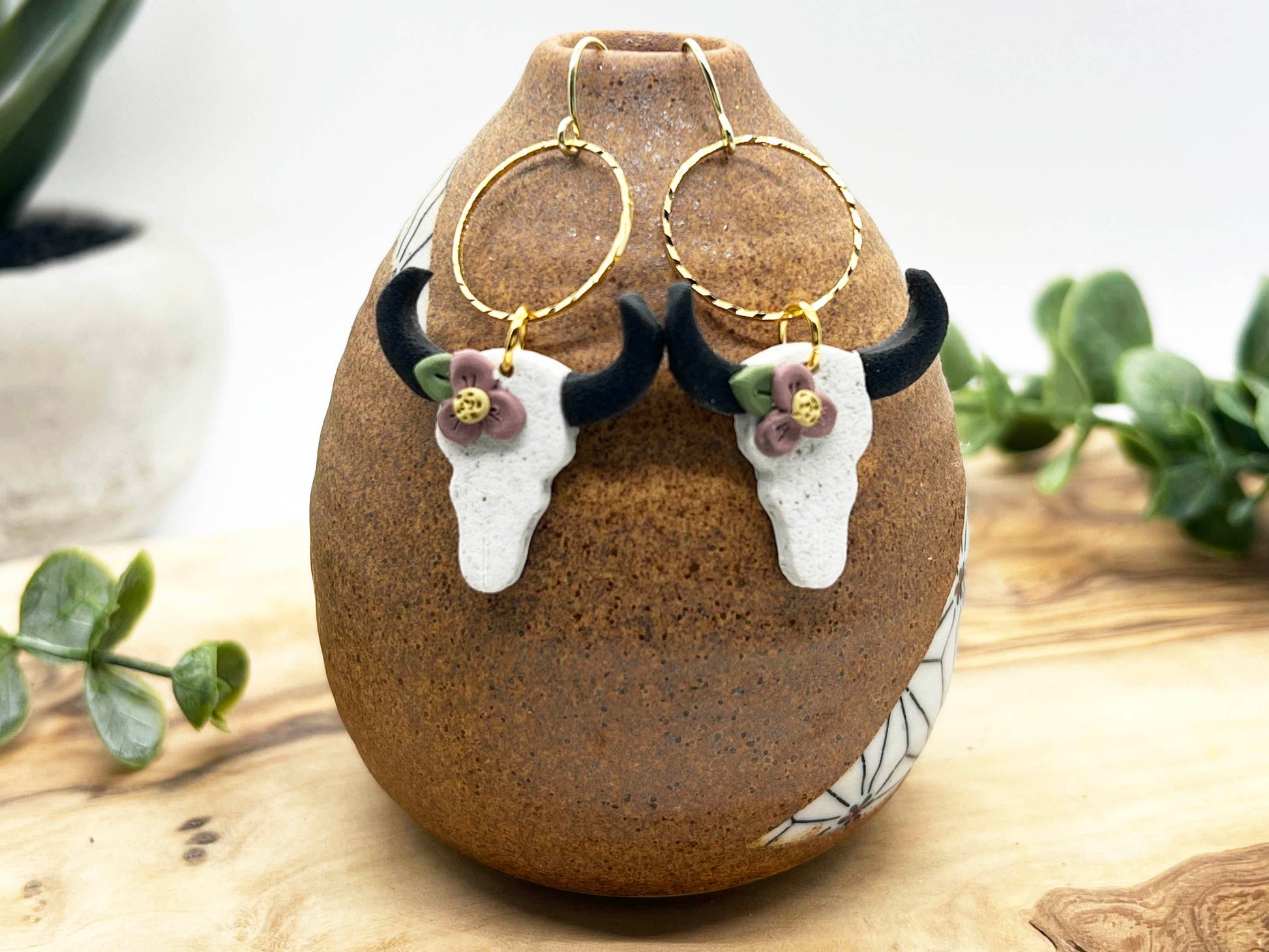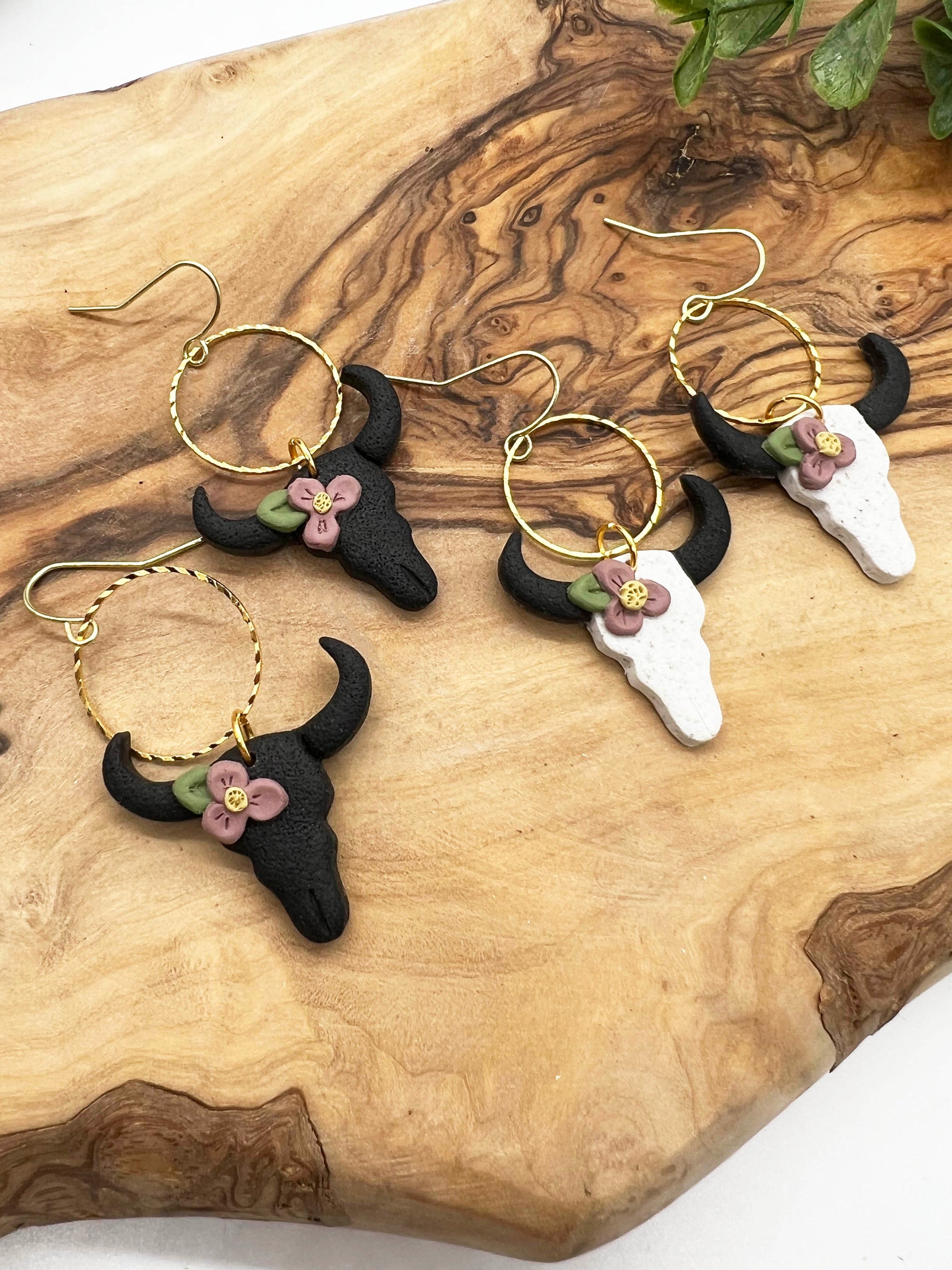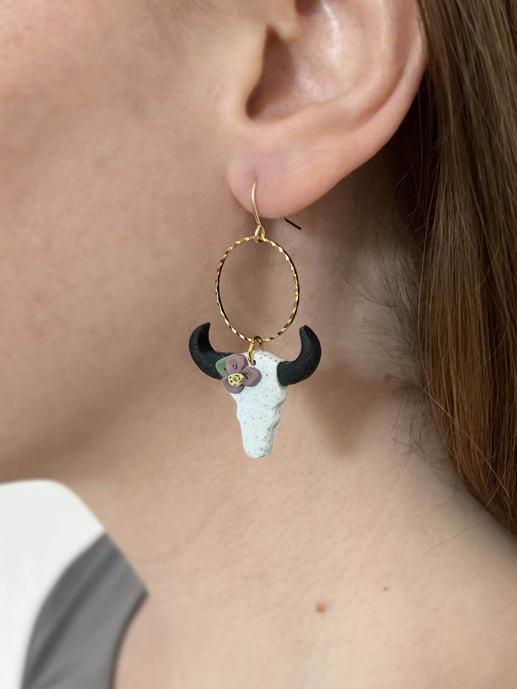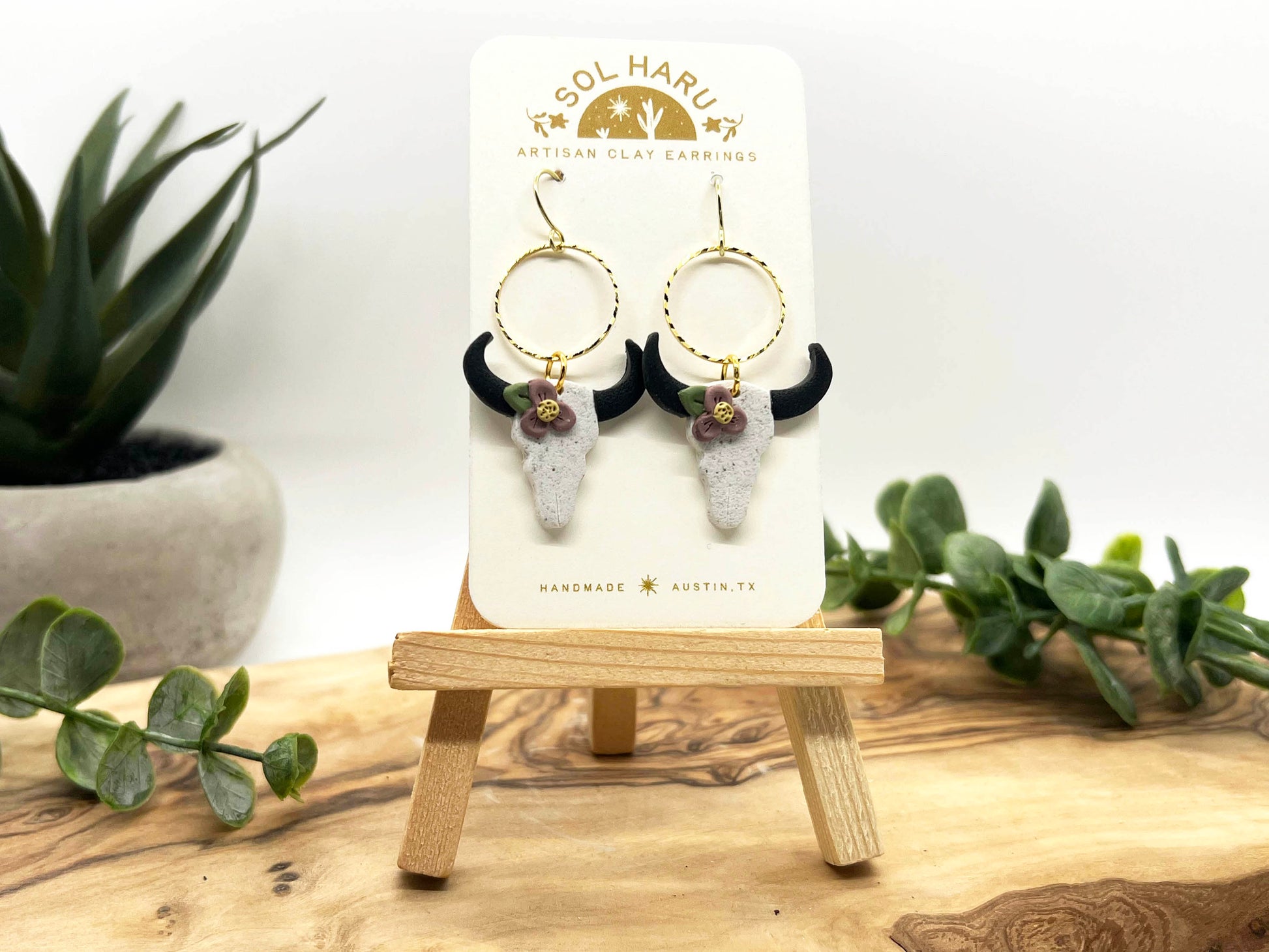 Textured cow skull in white stone speckles, black horns with handcrafted flowers. Lightweight polymer clay earrings handmade in Austin, TX. No two designs are the same as they are individually made by hand.