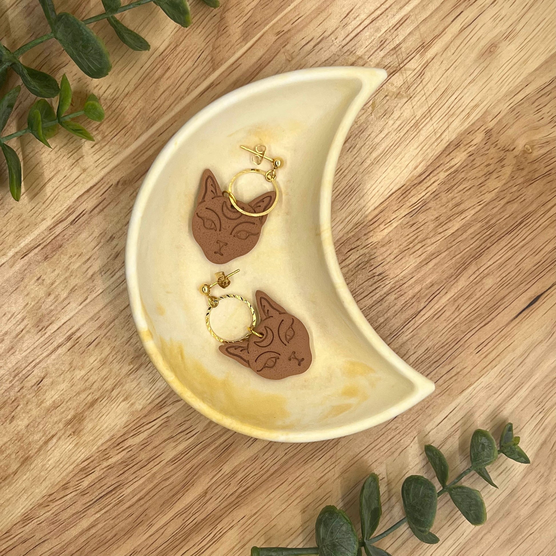 Fun moon cat heads in squash. Lightweight polymer clay earrings handmade in Austin, TX. No two designs are the same as they are individually made by hand.