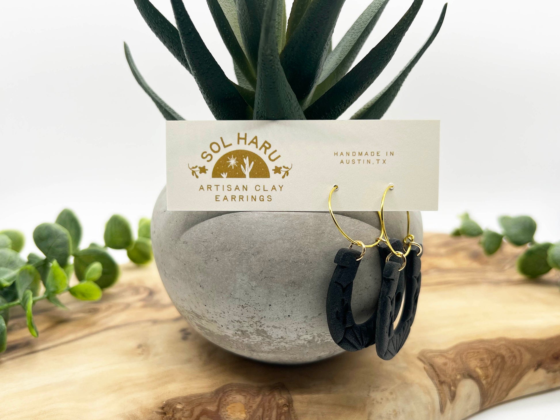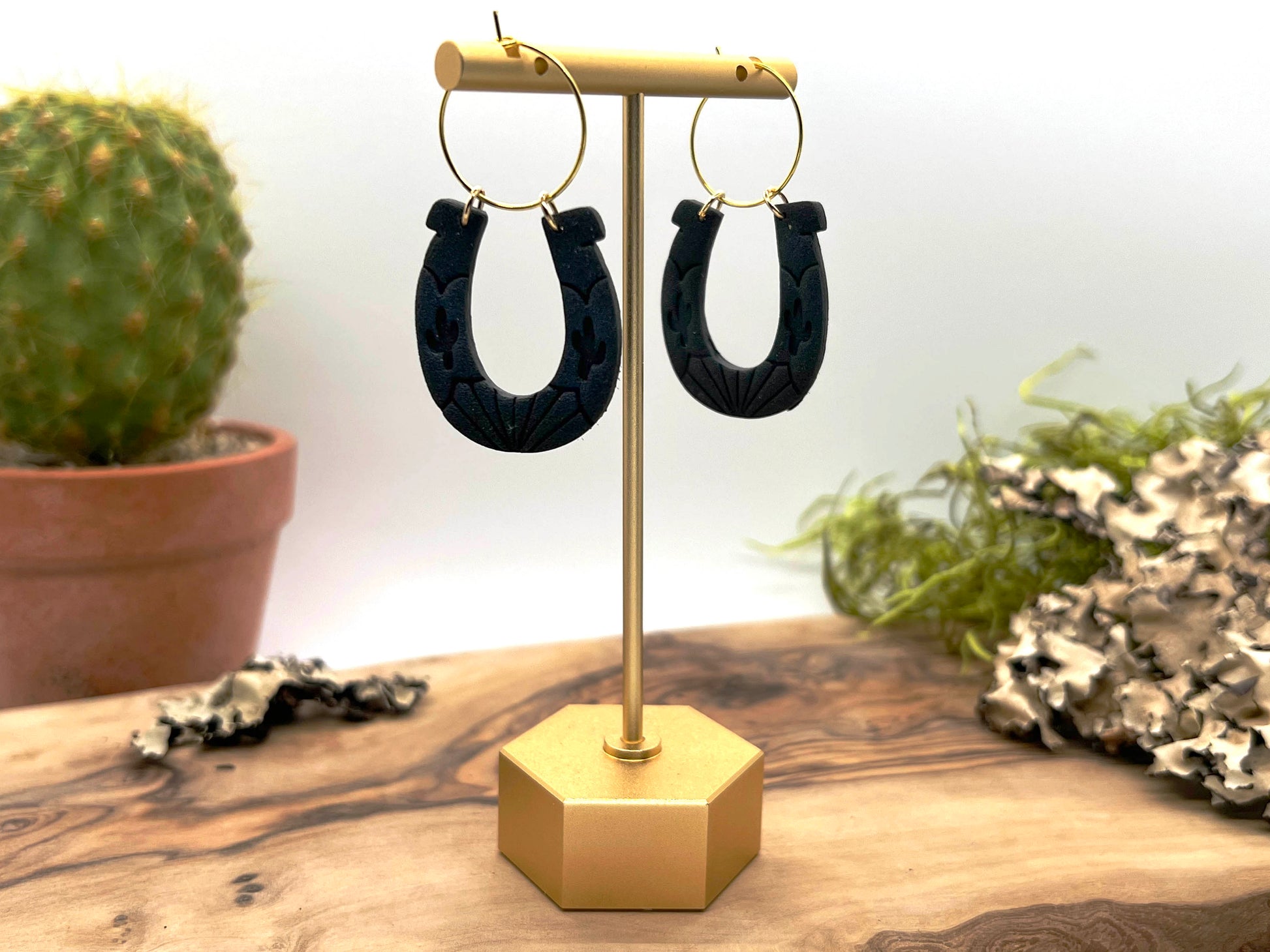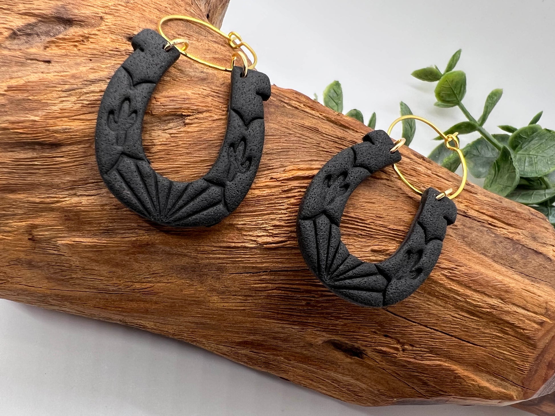 Textured horseshoe in black. Lightweight polymer clay earrings handmade in Austin, TX. No two designs are the same as they are individually made by hand.