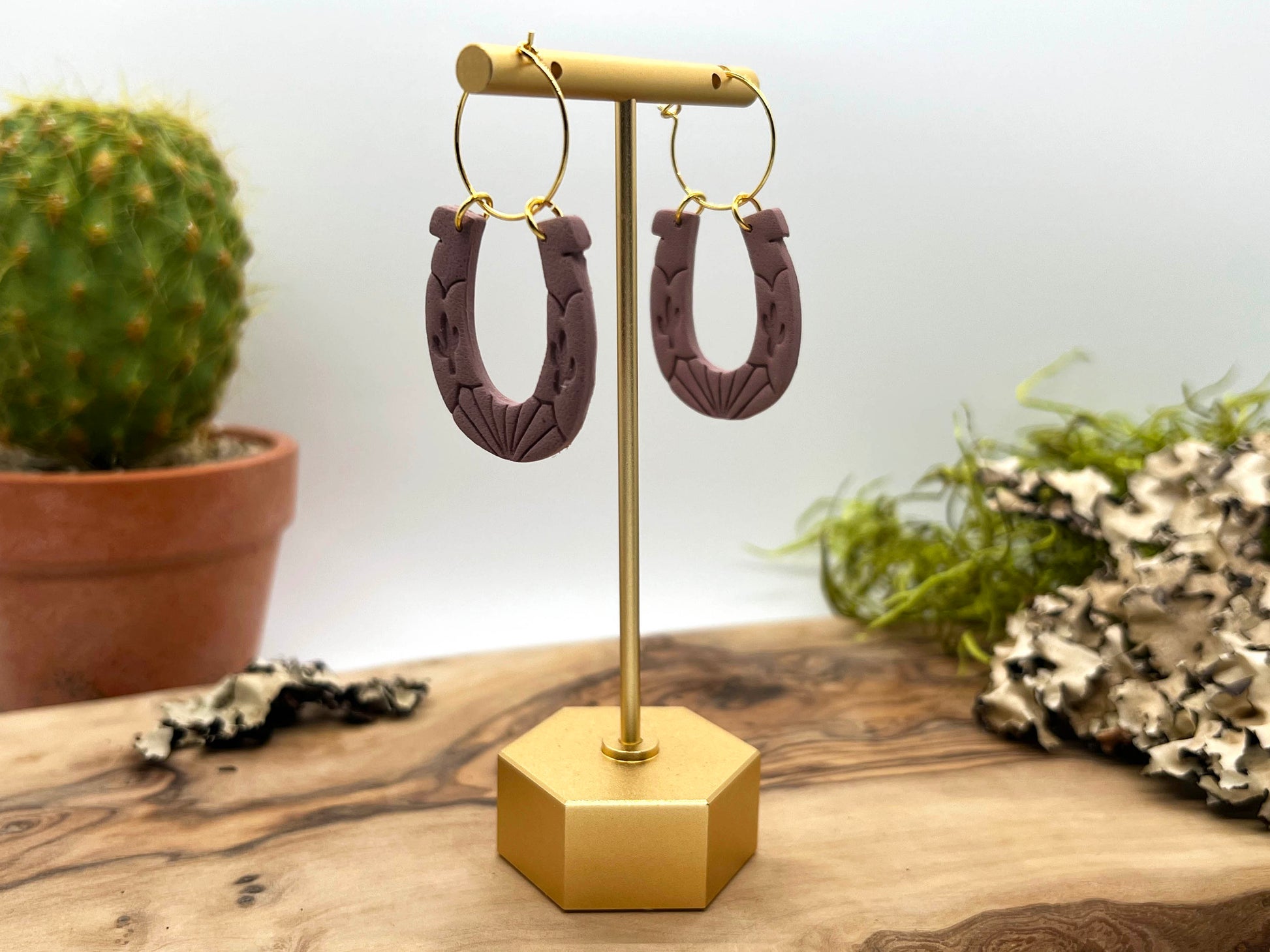 Textured horseshoe in mauve. Lightweight polymer clay earrings handmade in Austin, TX. No two designs are the same as they are individually made by hand.