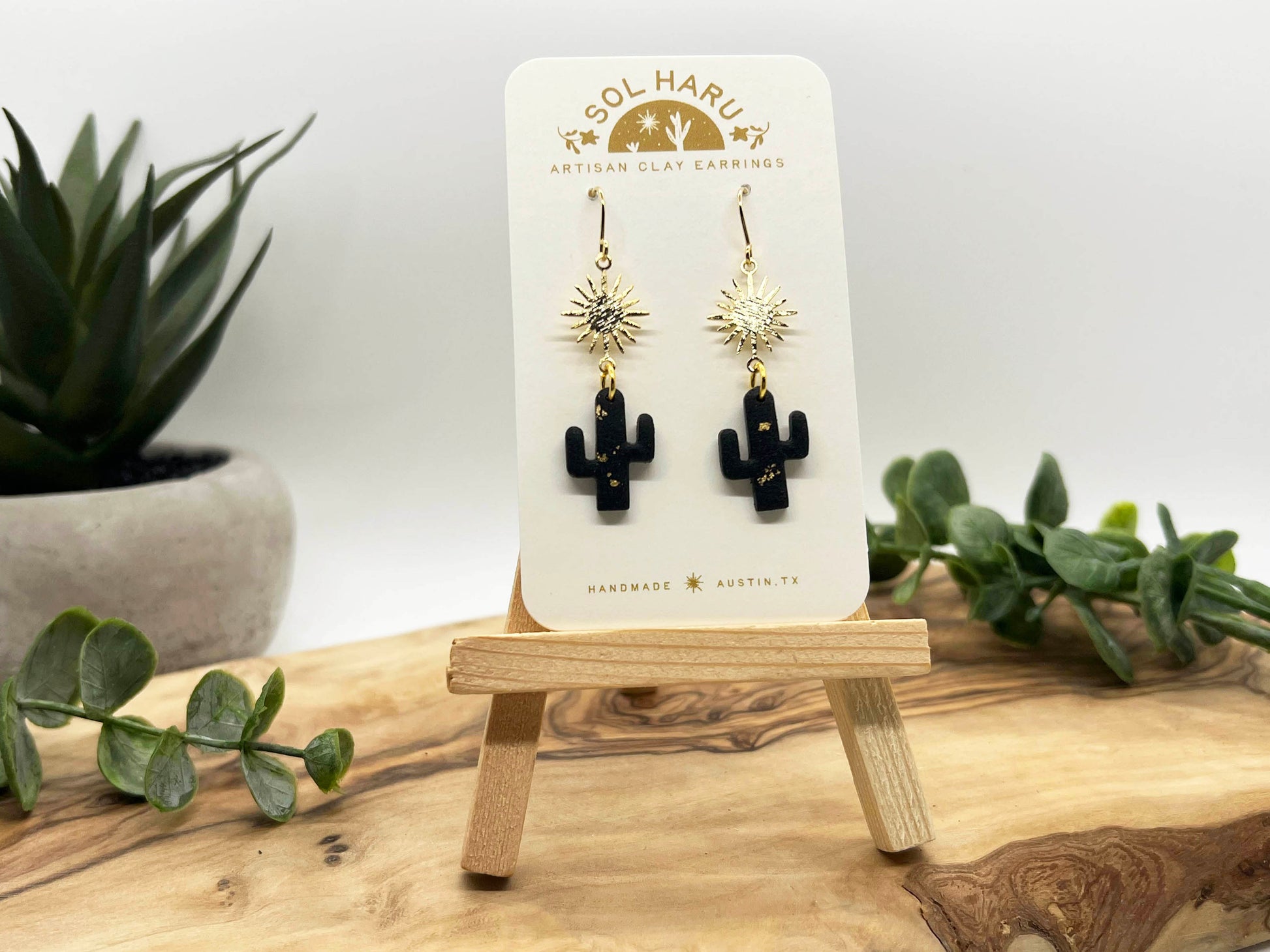 Sun and cactus featuring a gold sun and inspired by the Southwest. Lightweight polymer clay earrings handmade in Austin, TX. No two designs are the same as they are individually made by hand.