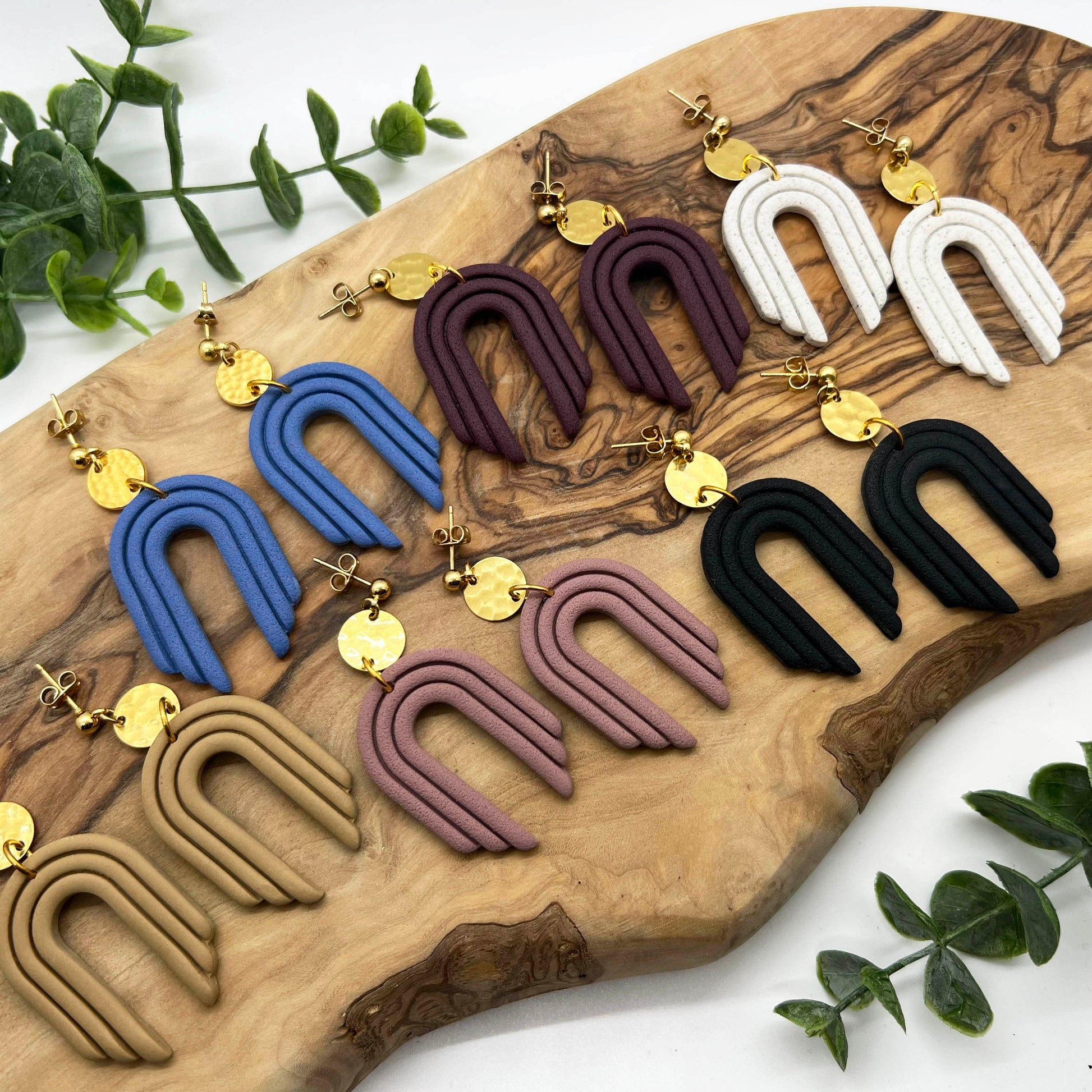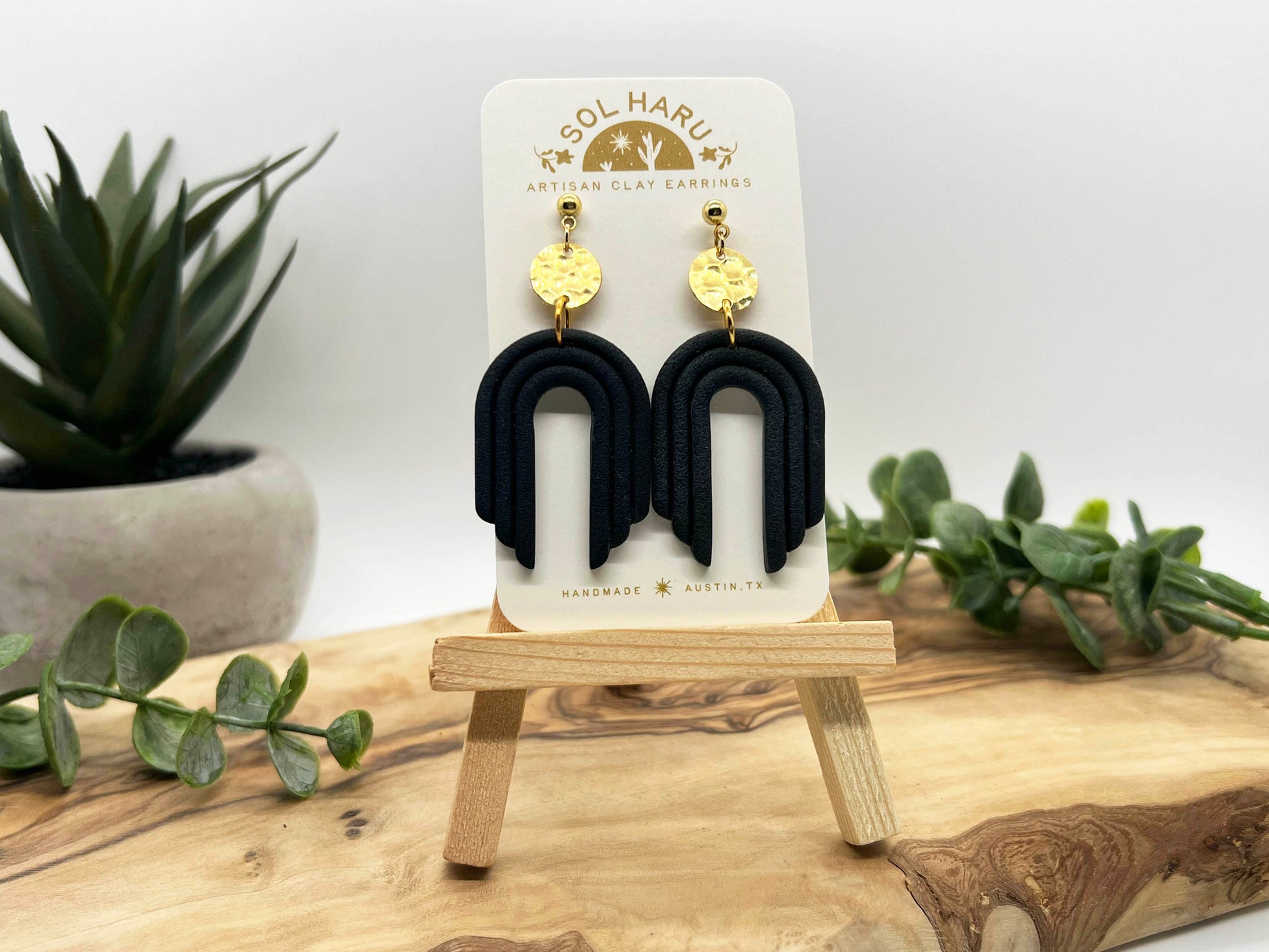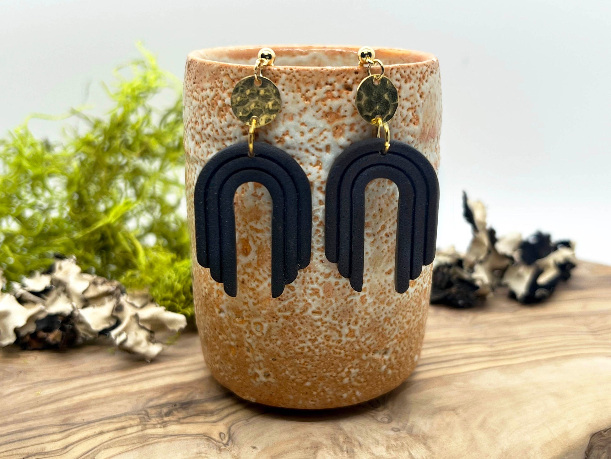 Textured boho style arch in black. Lightweight polymer clay earrings handmade in Austin, TX. No two designs are the same as they are individually made by hand.