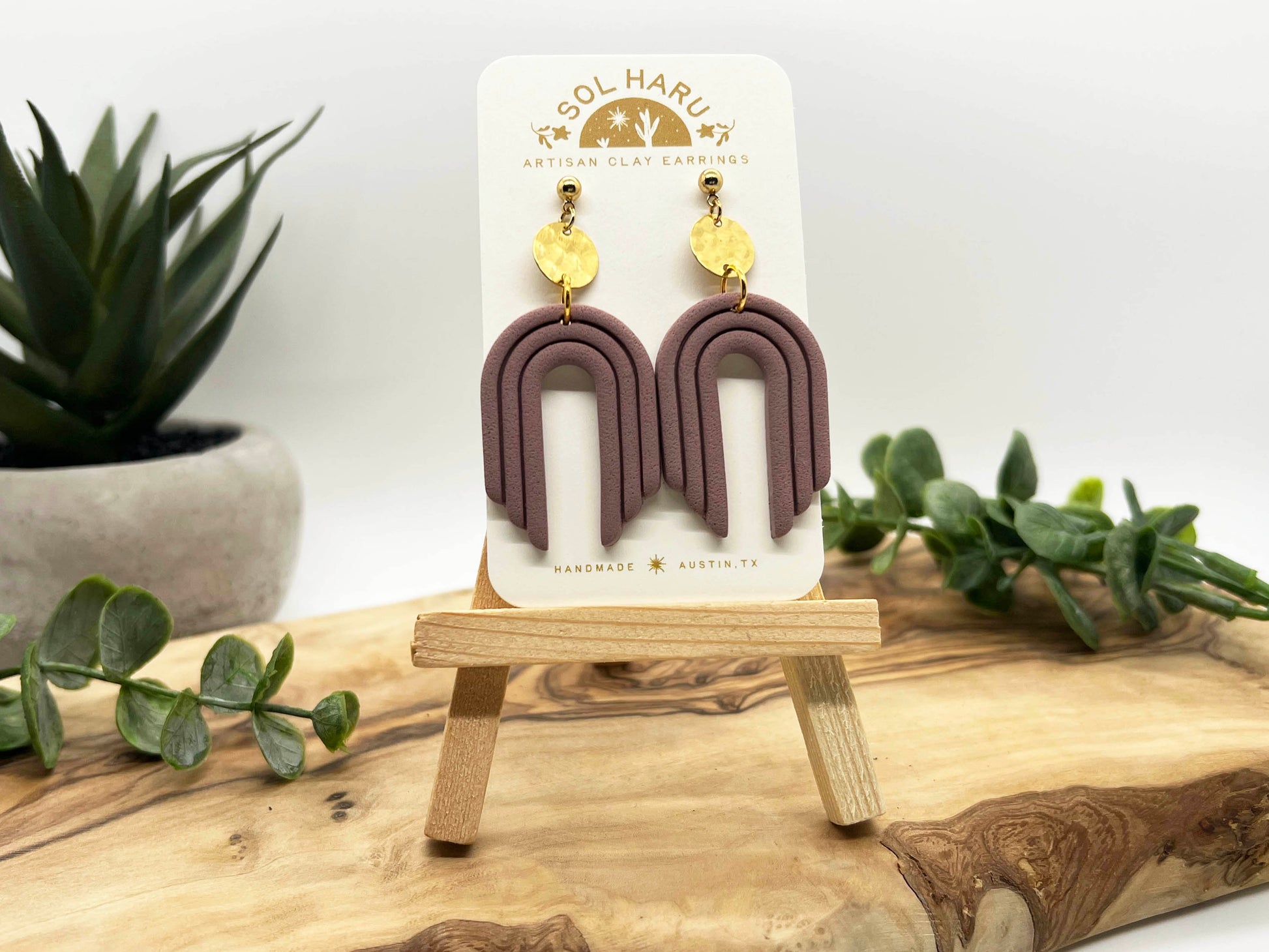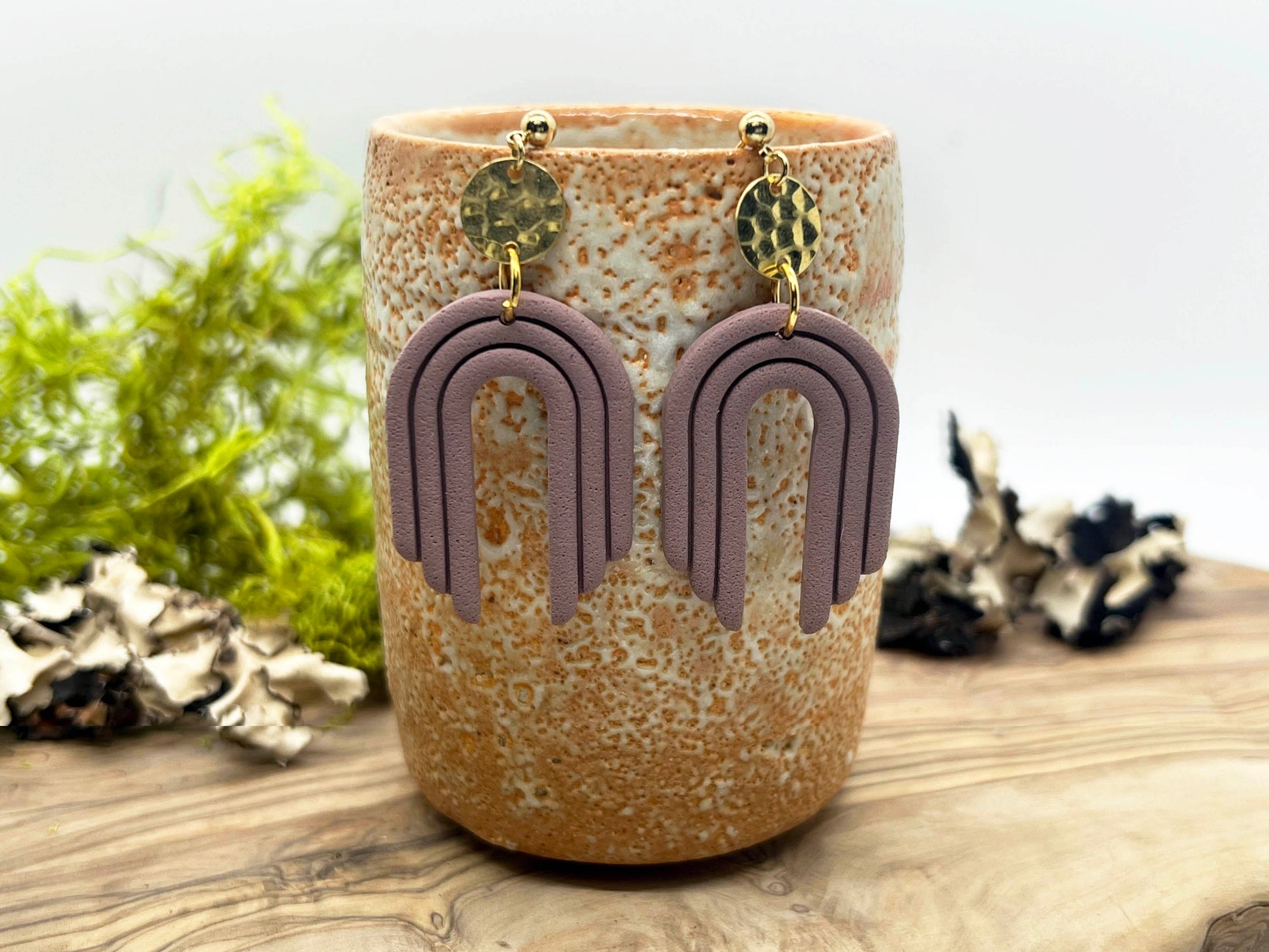 Textured boho style arch in mauve. Lightweight polymer clay earrings handmade in Austin, TX. No two designs are the same as they are individually made by hand.