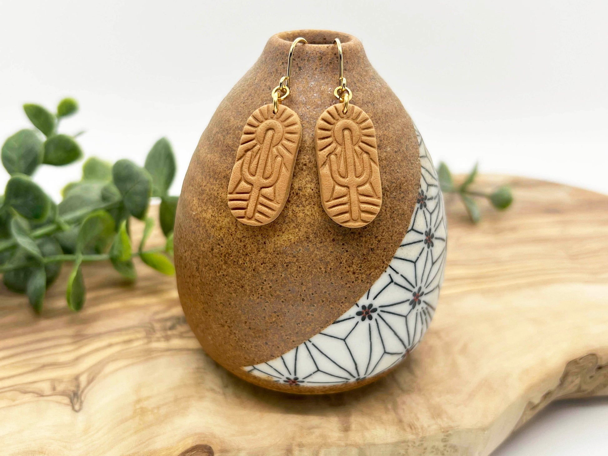 Cactus + sun rays in caramel. Lightweight polymer clay earrings handmade in Austin, TX. No two designs are the same as they are individually made by hand.