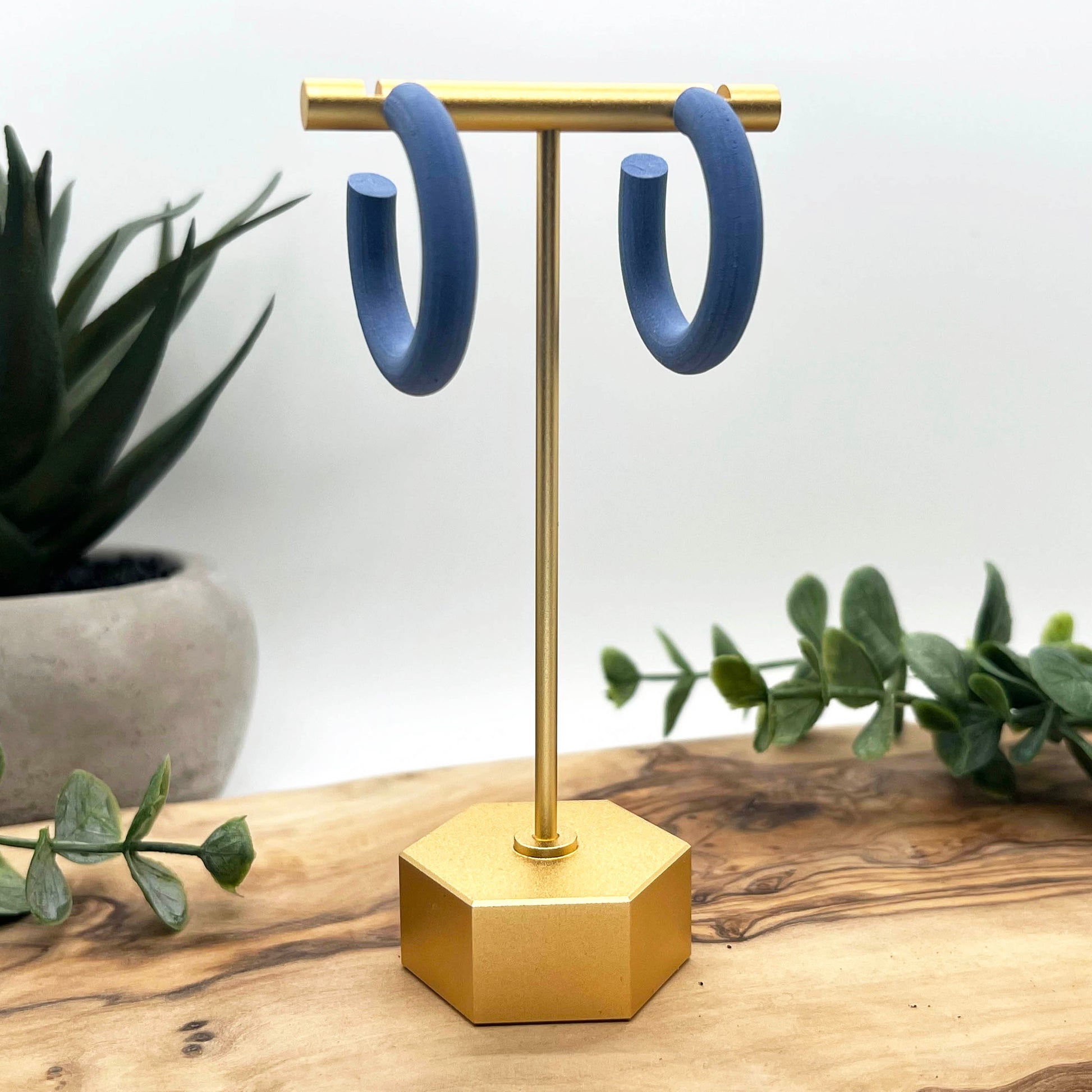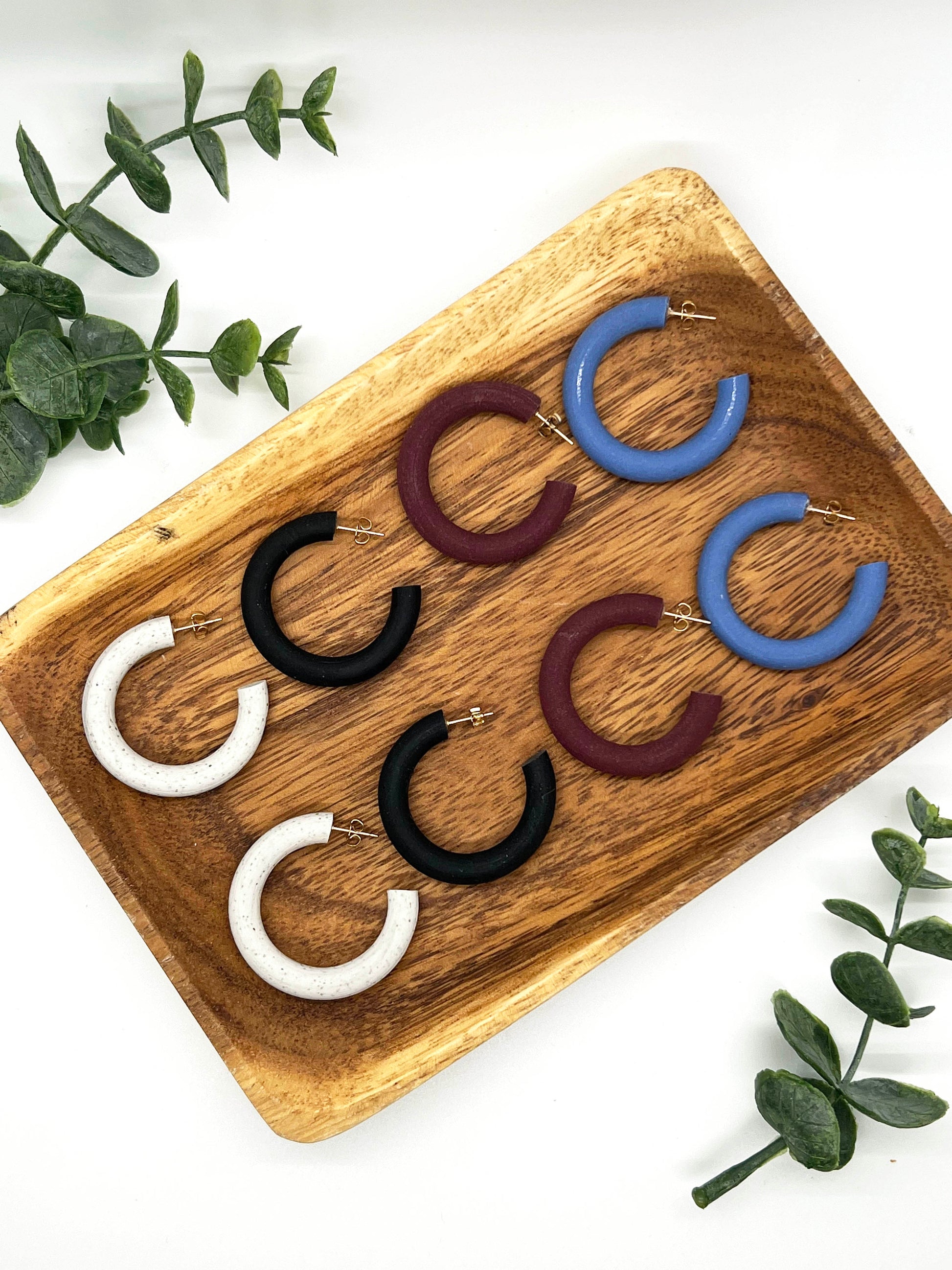 Thick solid lightweight hoops in airforce blue. Lightweight polymer clay earrings handmade in Austin, TX. No two designs are the same as they are individually made by hand.