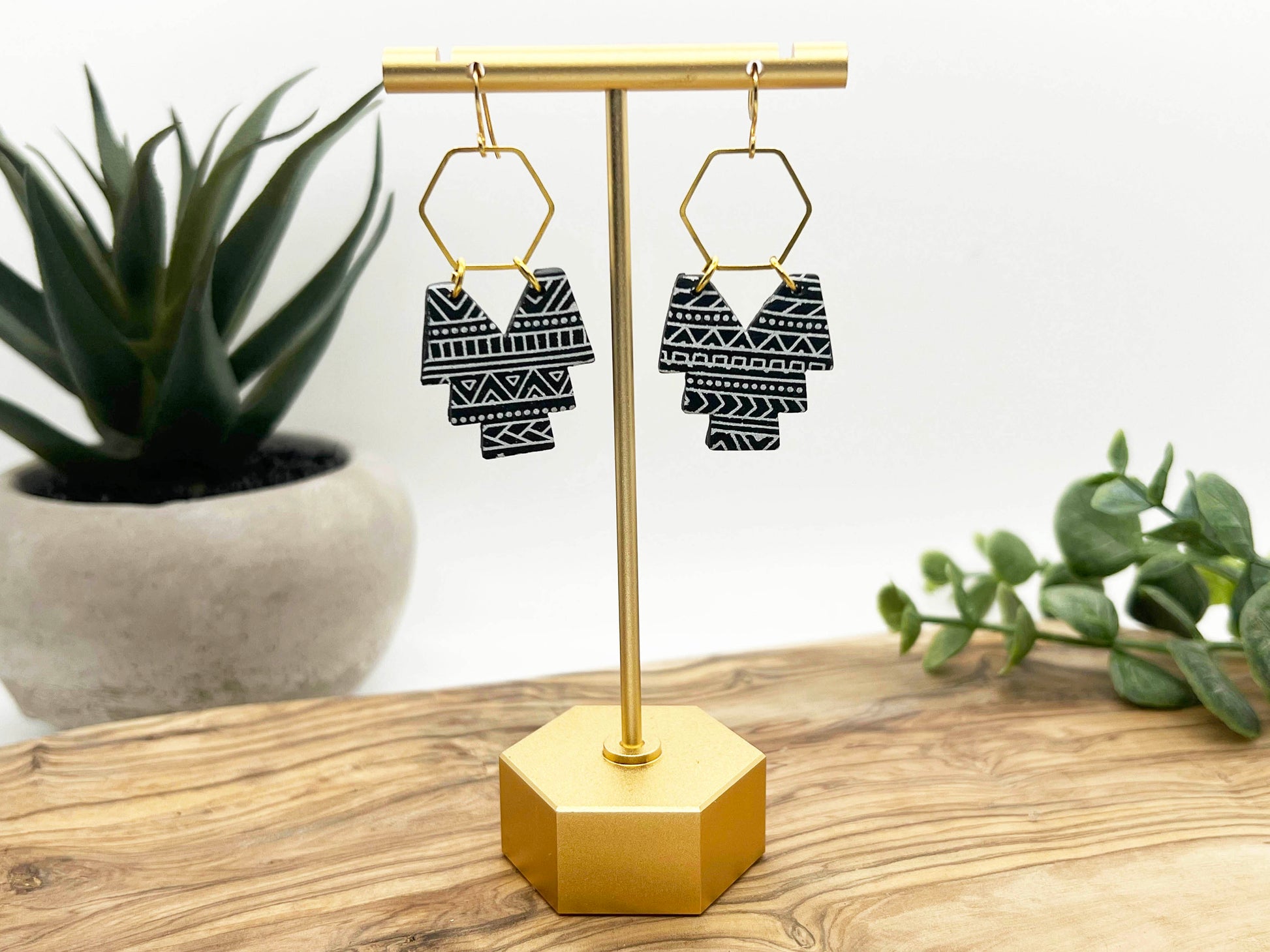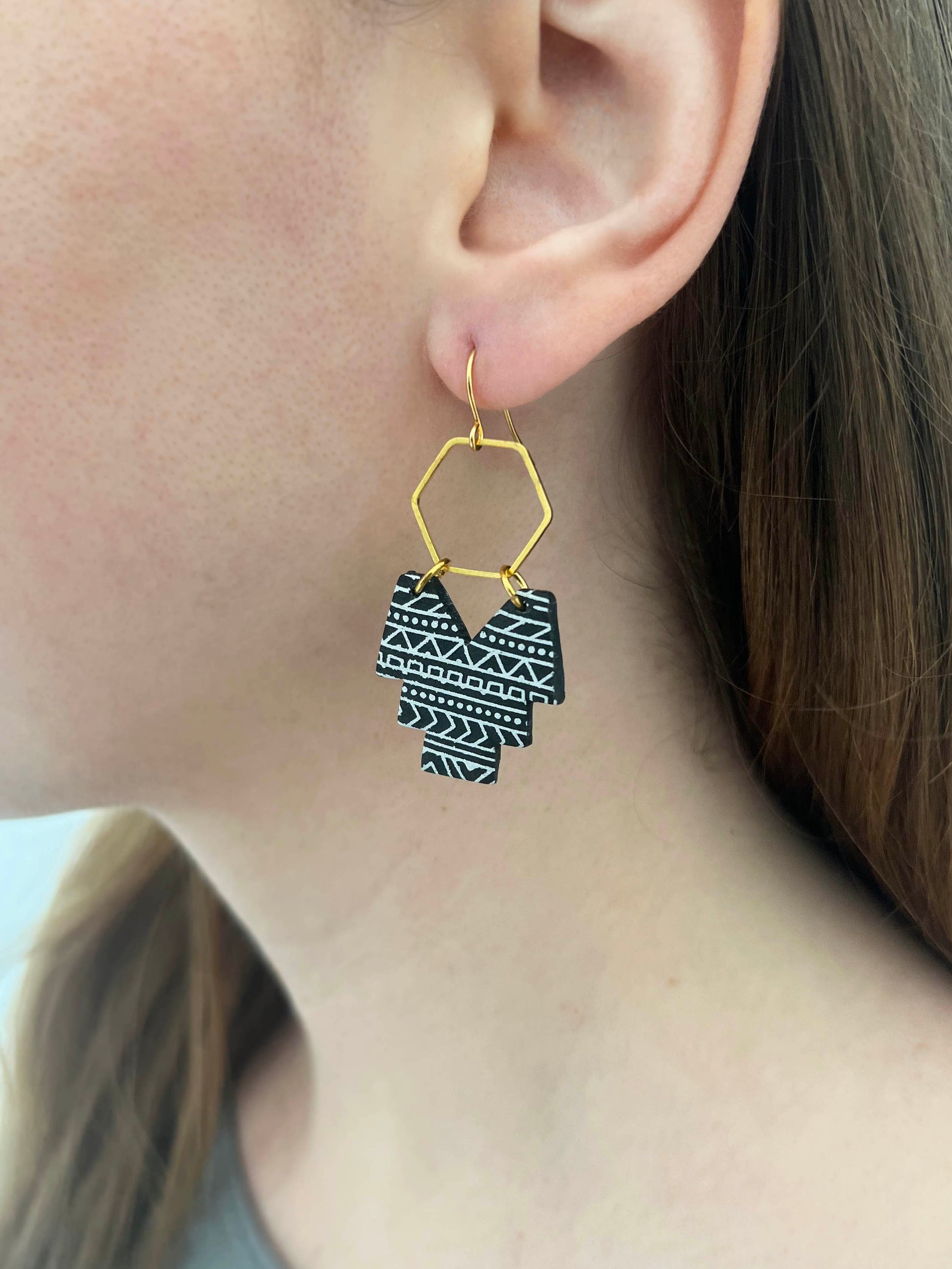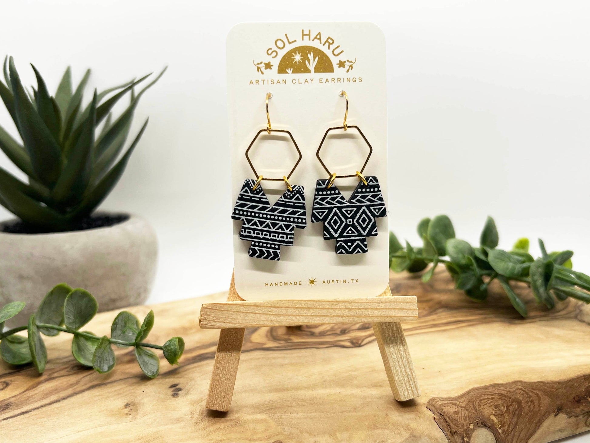 Southwest inspired pattern on black. Lightweight polymer clay earrings handmade in Austin, TX. No two designs are the same as they are individually made by hand.